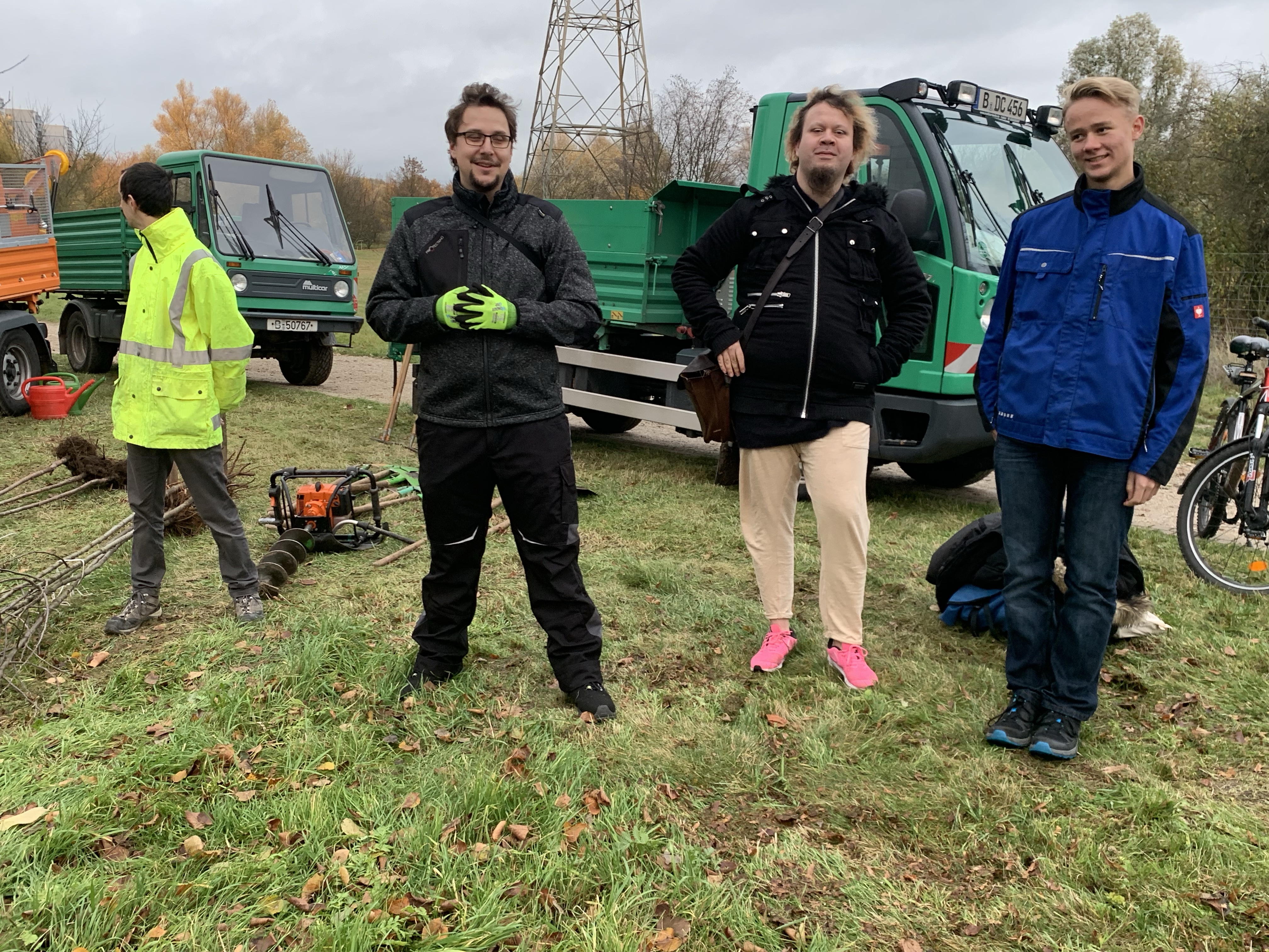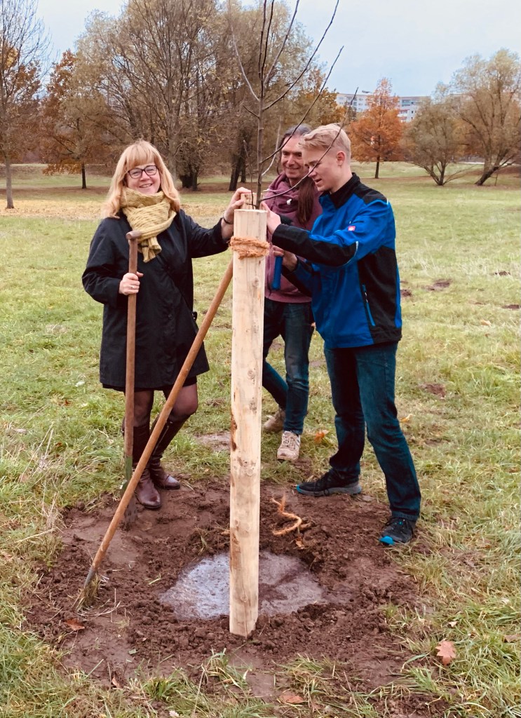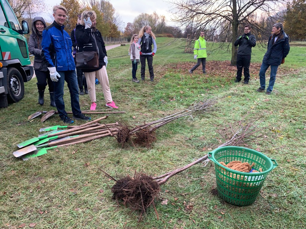 Heute am 5.11. war es soweit: eine Reihe von Obstbäumen wurde von uns gemeinsam gepflanzt, in wunderbarer Teamarbeit von Aktivist*innen mit ihren Kids und Anhang – und natürlich den Kolleginnen und Kollegen aus unserem Bezirk. Ganz feine Sache, mit Tipps zur richtigen Höhe, zu Schnitt, aber auch zur Tiefe des Pflanzloches, dem Gießen mit Kannen und dem neuen feinen Fahrzeug, und natürlich der Hoffnung, dass es nicht zu Zerstörung kommen möge. „Auch wenn die Welt morgen untergeht“… also das Pflanzen eines Apfelbaums ist immer eine gute Entscheidung, nicht erst seit Luther.