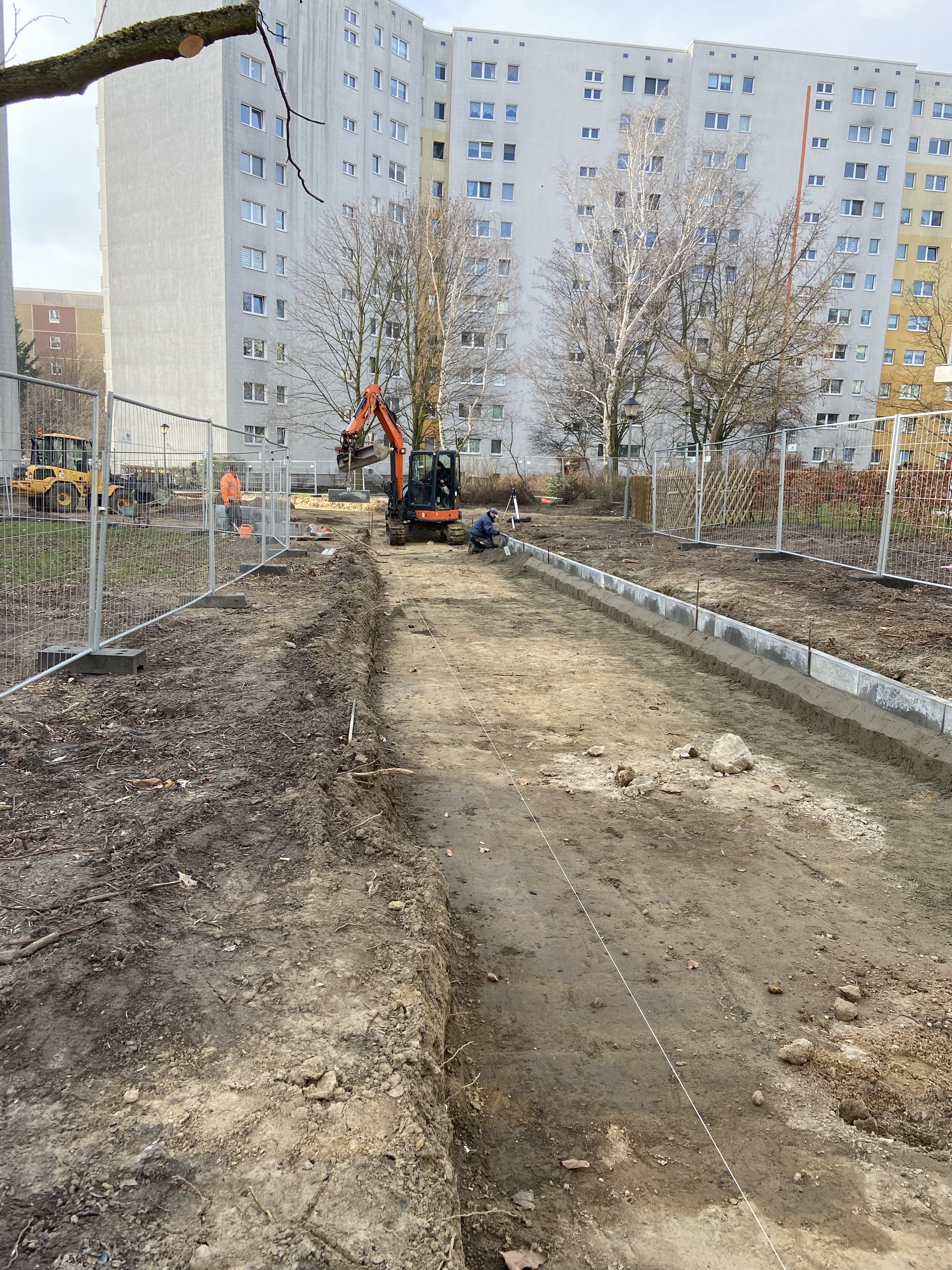 🔴Zwei gute Nachrichten für den Kiez: an jeder Stelle sind die Gartenfachleute am Bauen, die Gartenfachfrau kennzeichnet die letzten Steine, die den Weg zum Denkmal bilden. Überall sind die Arbeiten im Gange.