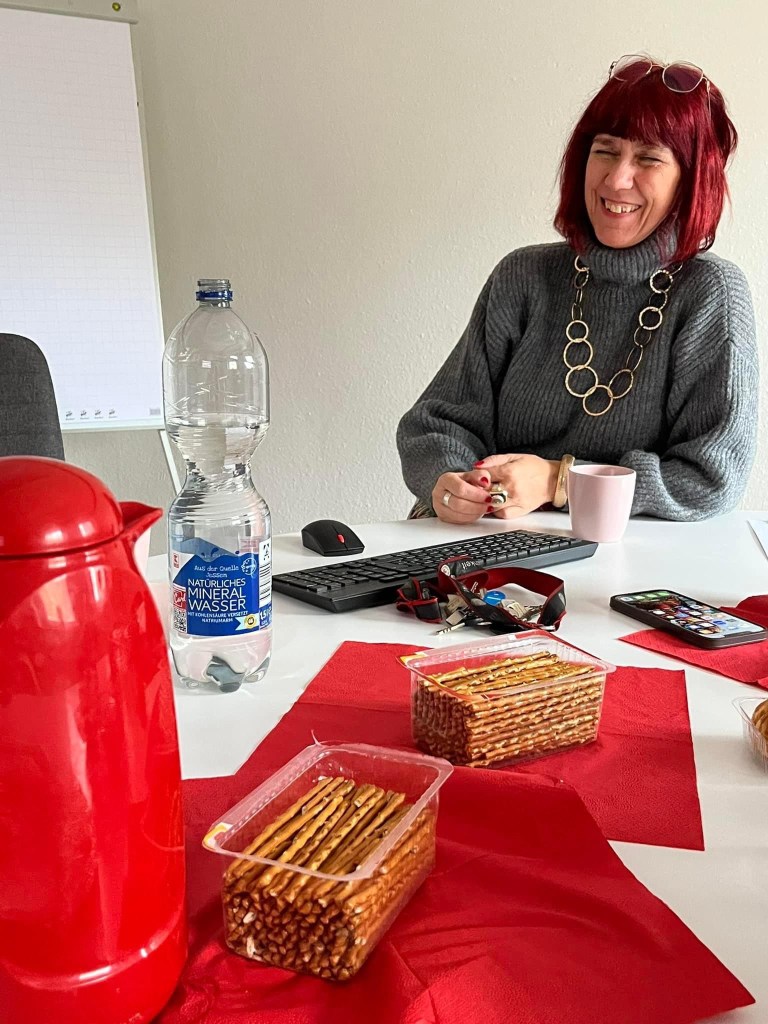 🟥 Weiter gehts: nach dem gemeinsamen Einsatz in Hellersdorf mit dem DRK KV Berlin Nordost e.V. bei der baulichen Prüfung des Gebäudes neben den Rhin Towers, braucht es Luft und bei der DRK Leiterin Kati Avci im Nachbarschaftszentrum Murtzaner Ring gibt es endlich Wasser, Kaffee und Trost. Gemeinsam gehen wir mit meinen Fotos am Bildschirm nochmal den erschütternden Einsatz durch.