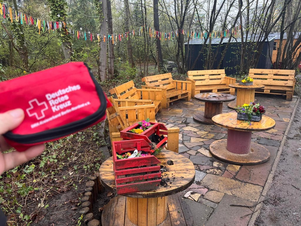 Zum Abschluss wandern Frau Schildhauer und ich durch den immer schöner werdenden den Garten und die neu eröffnete Fahrradwerkstatt. Überall neue Palettenbänke, Blumen, Gemüse ist gesäht.