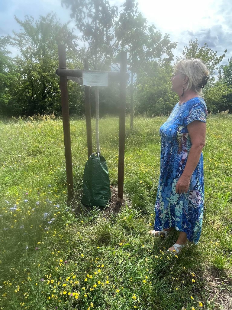 Zuerst gehen wir mit Frau Bärbel Kramer zum Friedensbaum, der hier fest steht und auch im Herbst dann weitere Gefährten mit Wurzeln erhalten wird.