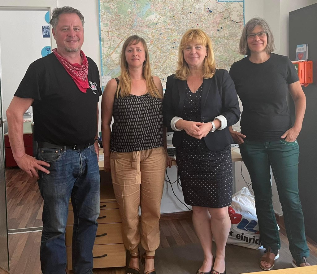 🟦 Nach zwei heissen Stunden Debatte im mittäglich schwülen Friedrichshainer Büro von Housing First Berlin heute Mittag sieht man uns, besonders mir, die Anspannung an. Kurzfristig und direkt zu meiner Abfahrt in Hellersdorf in meinem Büro hatte meine fachliche Begleitung aus dem Sozialamt absagen müssen. Den Termin ganz absagen kommt aber nicht in Frage. Nicht so einfach, dann an im letzten Jahre geführte Gespräche anschliessen zu wollen. Aber es ist gelungen ! Gemeinsam mit Karen Holzinger von der Berliner Stadtmission, Corinna Münchow, Projektleiterin, Sebastian Böwe und dem Team am Standort haben wir einen fachlichen Austausch geführt zum Ansatz von Housing First. Die Erfahrungen der Profis und die Professionalität sind schnell zu spüren.
