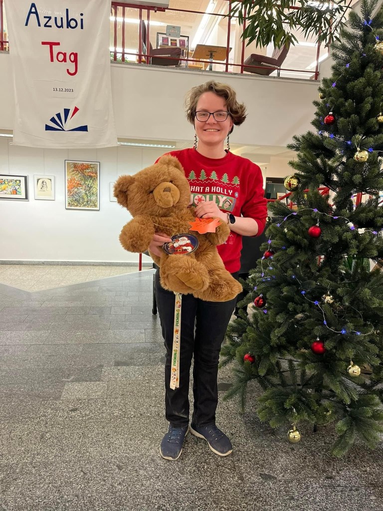 🟥 Zum Abschluss des Tages heißt es sich von diesem überaus kuschligen Bären trennen: da ich neulich beim Weihnachtswunschbaum hier in unserer Mark Twain Bibliothek im Freizeitforum Marzahn natürlich den Wunsch nach einem #Teddy mitgenommen hatte, hieß es heute, diesen Begleiter auf die Reise zu schicken. Mit einem passenden Pullover und natürlich einem liebevollen Lächeln hat eine der Auszubildenden unserer Bibliothek den Bären in ihrer Arme genommen, von wo er hoffentlich bald das Mädchen erreicht, welches sich einen Teddy gewünscht hat. Im übrigen gibt es gleich ein #Werbeblock,