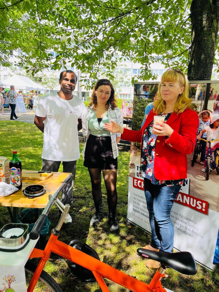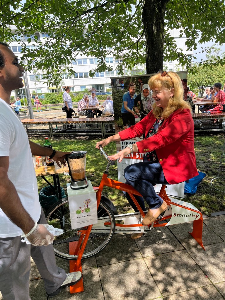 Um dann mit Blick auf Himmel und Wetter App trotzdem nicht abzusagen, sondern 14 Uhr gab es nach Plan die Eröffnung vom traditionellen jährlichen “Sommerfest auf dem Altlandsberger Platz”, organisiert von unseren #Stadtteilzentrum #Mosaik vom Träger Wuhletal und mit herzlicher Unterstützung durch die Kita nebenan, Leiterin Frau Koch, Geschäftsführerin Frau Willem und Petra Pau konnten gemeinsam mit mir die Eröffnung feiern. Inzwischen war alles trocken bei 30 Grad und alle froh, im Schatten der Bäume ihre Stände zu präsentieren. Das Rad mit Saftmixer kenne ich schon, hier von der Stephanus-Stiftung präsentiert eine feine Sache, Obst und frisches Gemüse gibt es fast an jedem Stand.
