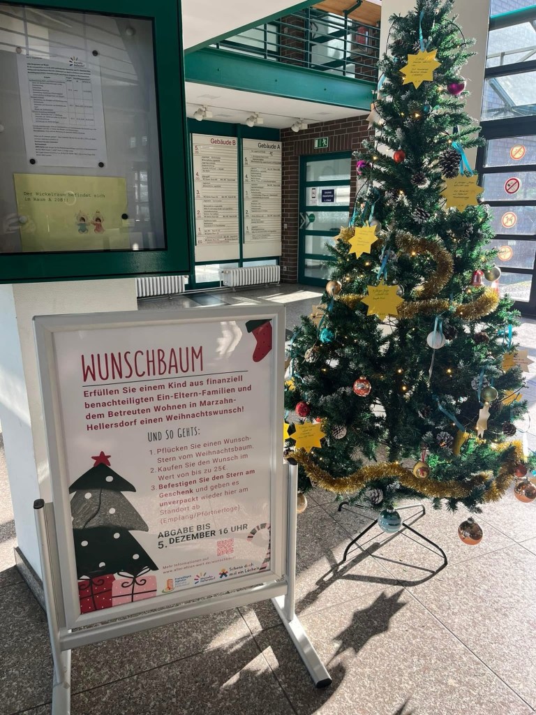 Seit 2021 ist der Bezirk mit dabei, ich erinnere mich an die ersten Debatten um Brandschutz und ob überhaupt Bäume in den Häusern stehen dürfen, die Dialoge mit unserer Brandschutzbeauftragten Frau Lehmann, und dann die ersten zwei Bäume. Inzwischen stehen vier Wunschbäume hier, im Foyer vom Rathaus Marzahn, im Besucherzentrum der Gärten der Welt, hier zum Start im wunderschönen Foyer der Bibliothek im Freizeitforum und nun auch hier im Foyer im Sozialamt und Jugendamt der Riesaer Straße.