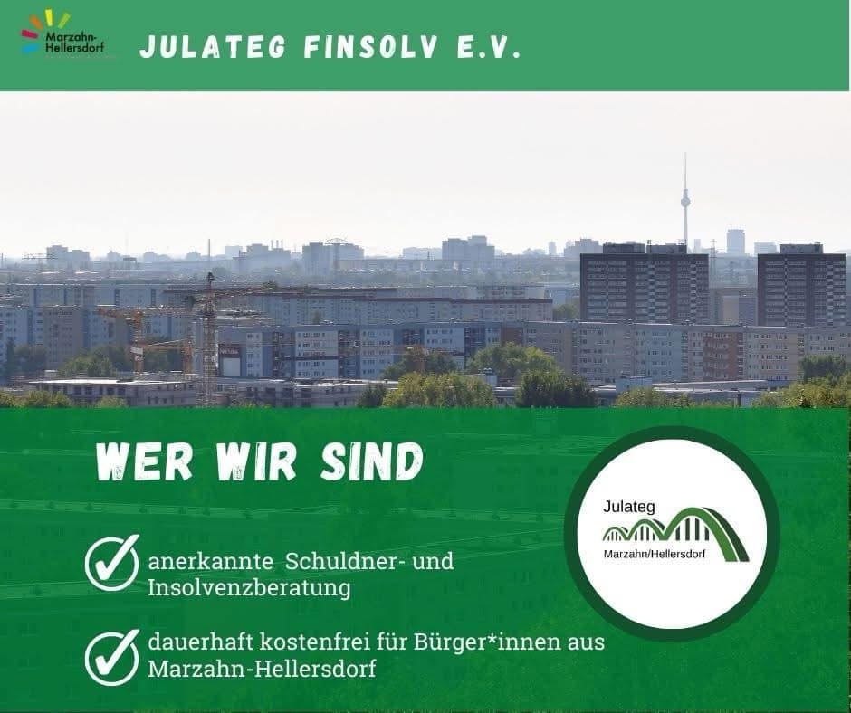 Die „Julateg Finsolv Marzahn / Hellersdorf e.V.“ ist ein gemeinnütziger Verein, der sich ausschließlich auf das Gebiet der Schuldner- und Verbraucherinsolvenzberatung spezialisiert hat. Das Beratungsangebot wird finanziert vom Bezirksamt Marzahn-Hellersdorf und ist für Nutzerinnen und Nutzer dauerhaft kostenfrei, unverbindlich und vertraulich.