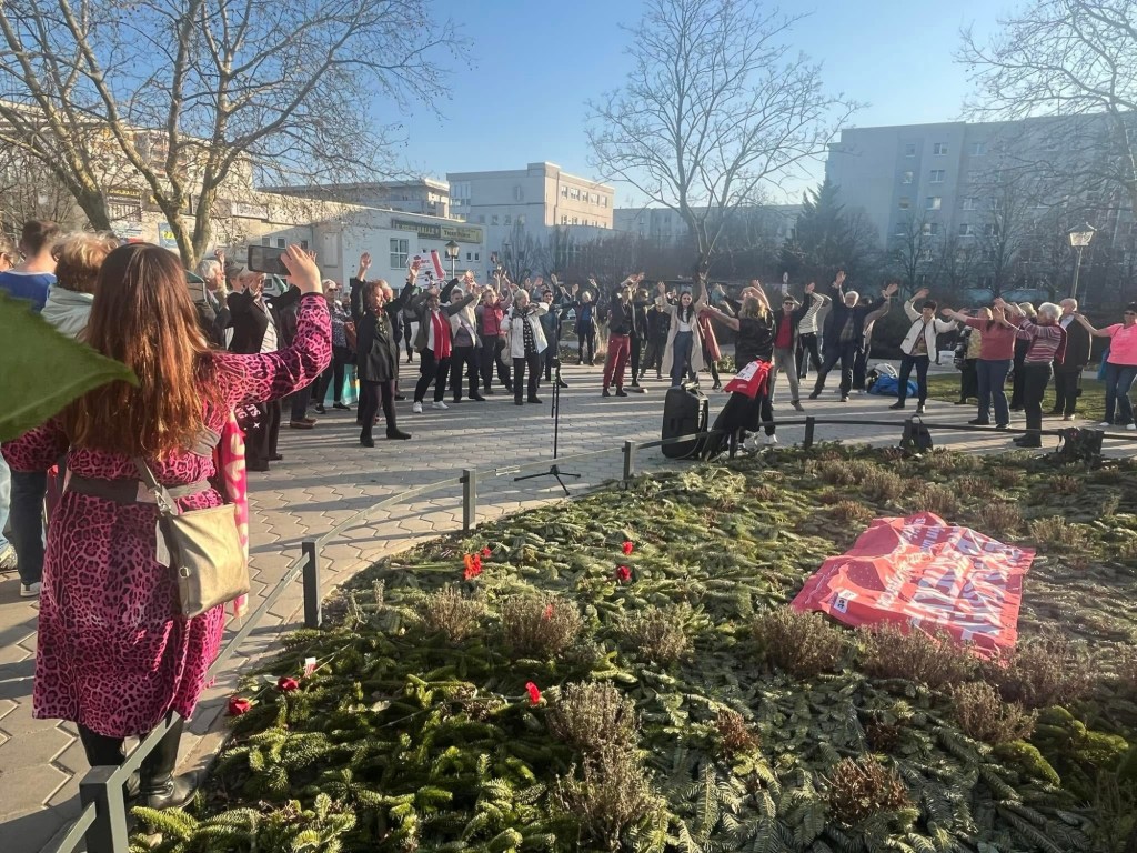 Die Zeit war günstiger gewählt, diesmal um 16 Uhr sind viele aus dem Feierabend gekommen, und eine traditionelle Brotscheibe, von Bjoern Tielebein und Sarah Bigall liebevoll überreicht, war bei allen sehr willkommen. Der späte Beginn, der unglaubliche Sonnenschein, die Wärme am 7. März war sicher mit ausschlaggebend, dass diesmal eine sehr große Menge Gäste das Programm verfolgte, einige auch in respektvoller Entfernung mit ihren Kids vom Spielplatz aus.