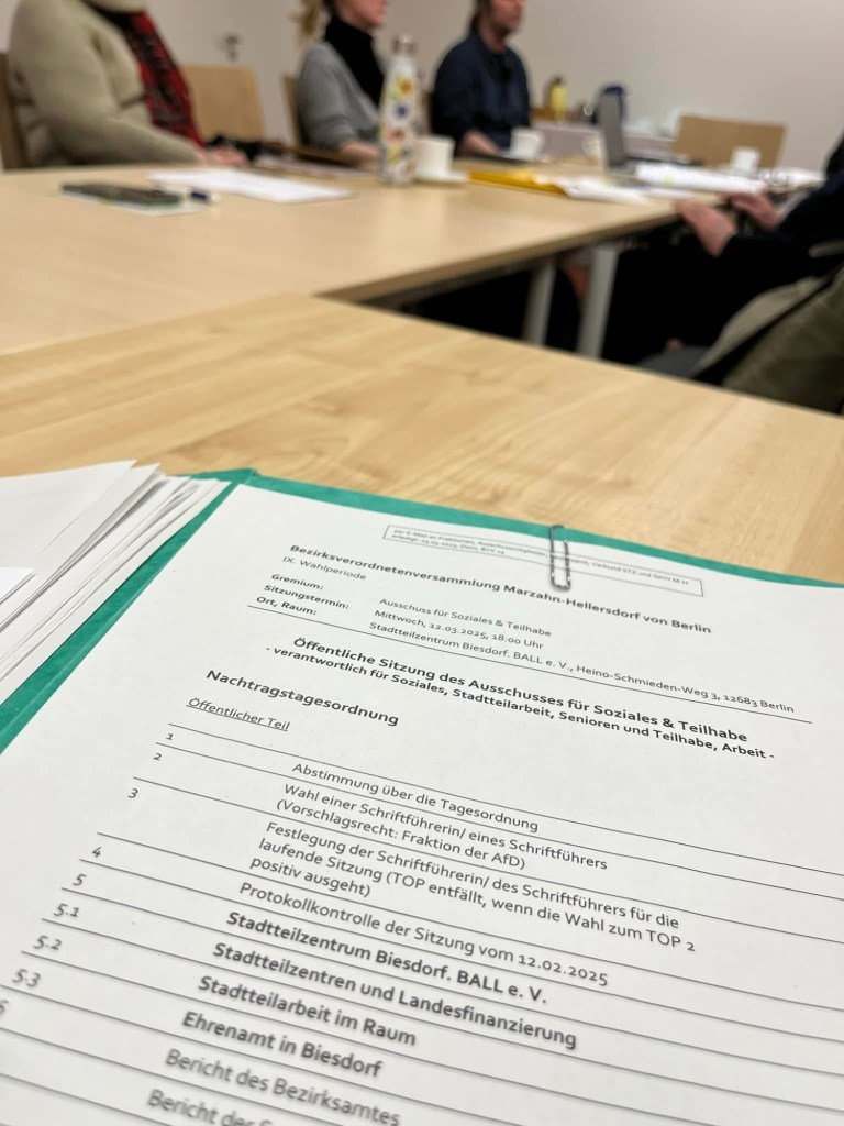 🟩 Der Ausschuss SOZIALES tagte gestern Abend erneut an einem Ort, der formell noch gar nicht eröffnet worden ist, aber auf den die Biesdorferinnen und Biesdorfer natürlich genau so lange gewartet haben wie der Träger BALL e.V.: wir sind nun endlich im neuen STADTTEILZENTRUM Biesdorf im alten GUT BIESDORF an der B 1. Inzwischen ist es ein belebtes Wohngebiet, mittendrin und damit auch gut sichtbar und einsehbar wird das Stadtteilzentrum nun sein.