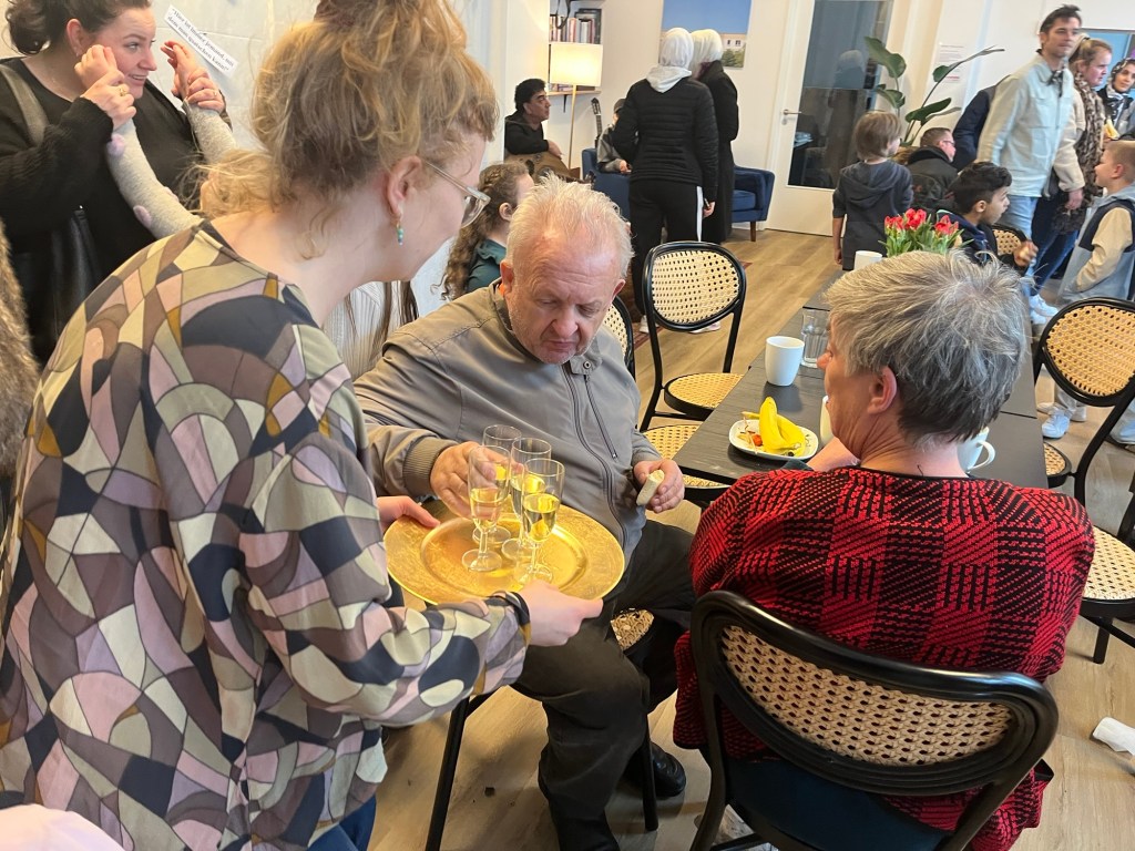 Schon von weitem waren die Menschen vor dem Raum auf der Strasse zu sehen, drinnen wurde es erst recht voll und laut. Erst einmal war zu spüren: hier haben sich wirklich viele und sehr lange drauf gefreut, hier haben viele sehr dringend gewartet, dass es nun los geht. Und es hat sich gelohnt. Ein heller, gut gestalteter Raum mit großen Fenster zur Strasse, quasi in Laufentfernung zur U-Bahn und mittendrin zwischen traditionellen Quartieren, die hier um in den 90igern errichtet worden warn, dann die Nachfolgebauten der Stadt und Land, die im Ockerton die Strasse prägen und gegenüber die sandfarbenen neuen Häuser, dazu die Einrichtung der Geflüchteten. Mehr Mix der Generationen und Herkünfte gibt es kaum auf 100 m. ❤️ Das Tolle ist: alle waren heute da und vor Ort bei der Einweihung, haben sich in der super chic und praktisch gestalteten Küche gedrängelt, die leckeren Gebäckstücke gekostet und auf den sehr praktischen und außergewöhnlich schönen Stühlen schon mal ausgetestet, wie das hier werden kann und wird. Die Liebe und Sorgfalt, mit der hier offene Räume und #Gemeinschaftsorte gestaltet, eingerichtet werden, modern, hell und nutzbar, zeigt sich auch in den auf Leinwand gezogenen Bildern an der Wand. Dem glücklichen „Dreier Team“, alle geschickt leicht zu erkennen im hellen Strickpullover, war die Freude deutlich abzulesen. Nachbarn wie Frau Niemann und Oleg vom Stadtteilzentrum Hellersdorf – Ost kamen, die Senioren und Rentner aus dem Haus, Leute aus der Unterkunft von nebenan, fantastische Musiker, es wurde gebastelt, gekocht und es war super laut, weil voller Kinder, voller Leute, die sich umarmten.