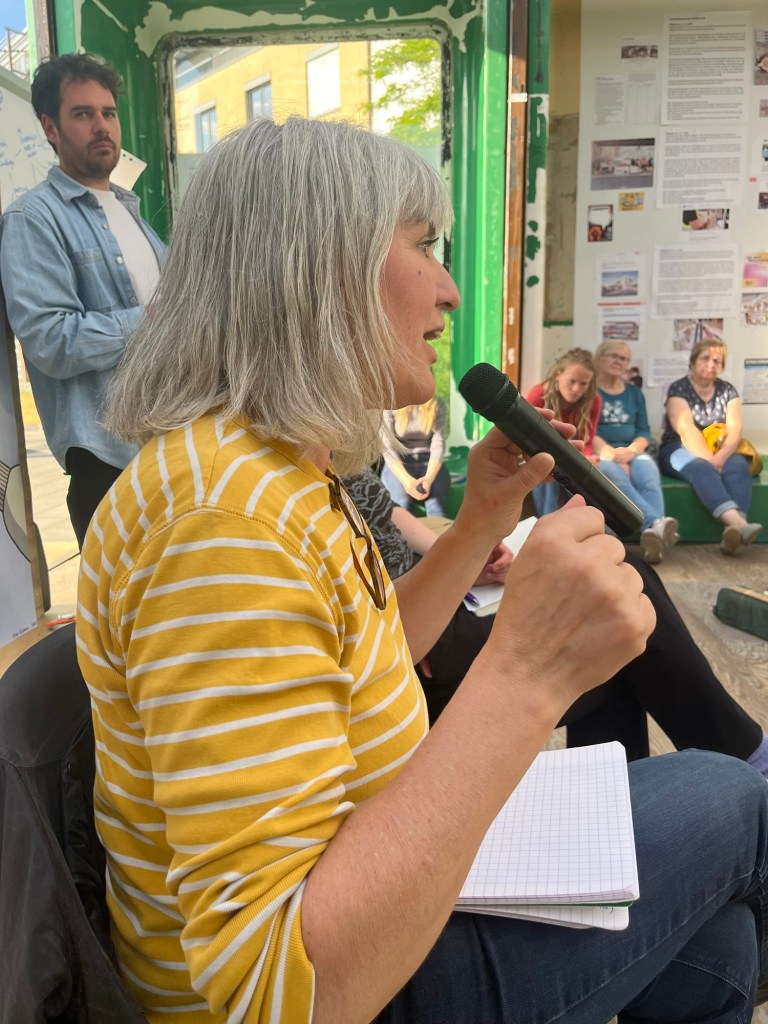 Sehr interessant waren – neben meinen Mitdiskutierenden auf dem Podium – die Beiträge aus dem Publikum, Sarah vom Kompass Stadtteilzentrum Hellersdorf , von der langjährigen Standortmanagerin in der Hellen Mitte, Frau Karin Büttner und Bernd Preußer. Katalin Gennburg, seit heute im Ausschuss Stadtentwicklung des Bundestages, konnte zum Schluss alle ermutigen, sich einzubringen! Gute Debatten noch im Anschluss in der Abendsonne, der Standort befördert sichtlich solche Diskussionen! Dank auch an die Lehrkräfte der ASH!