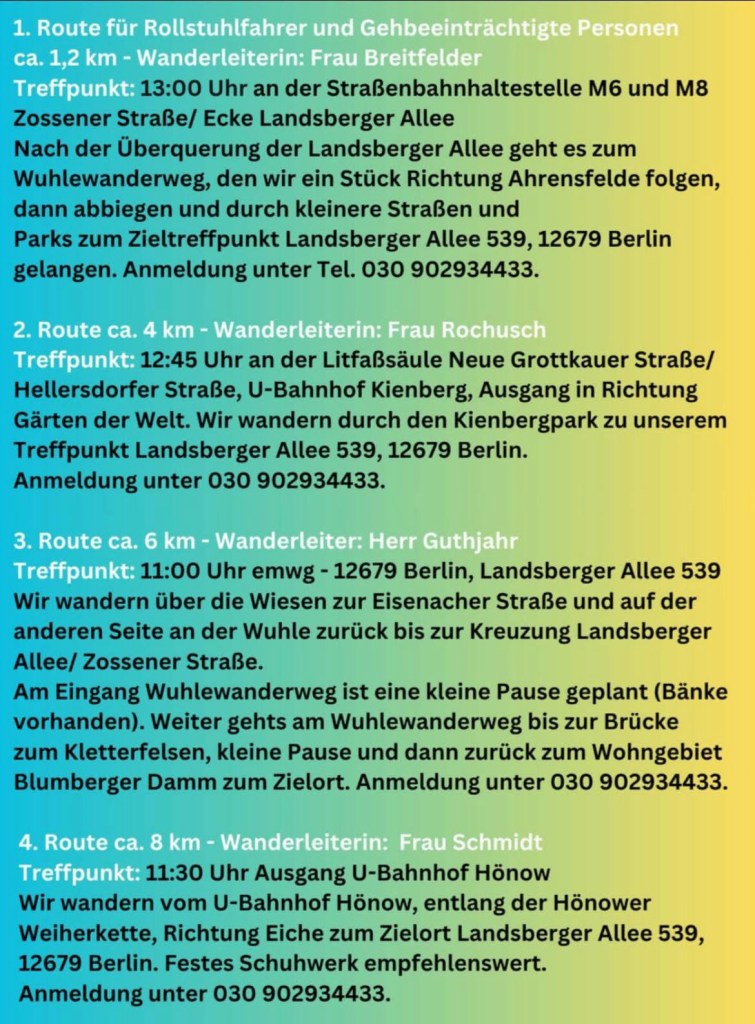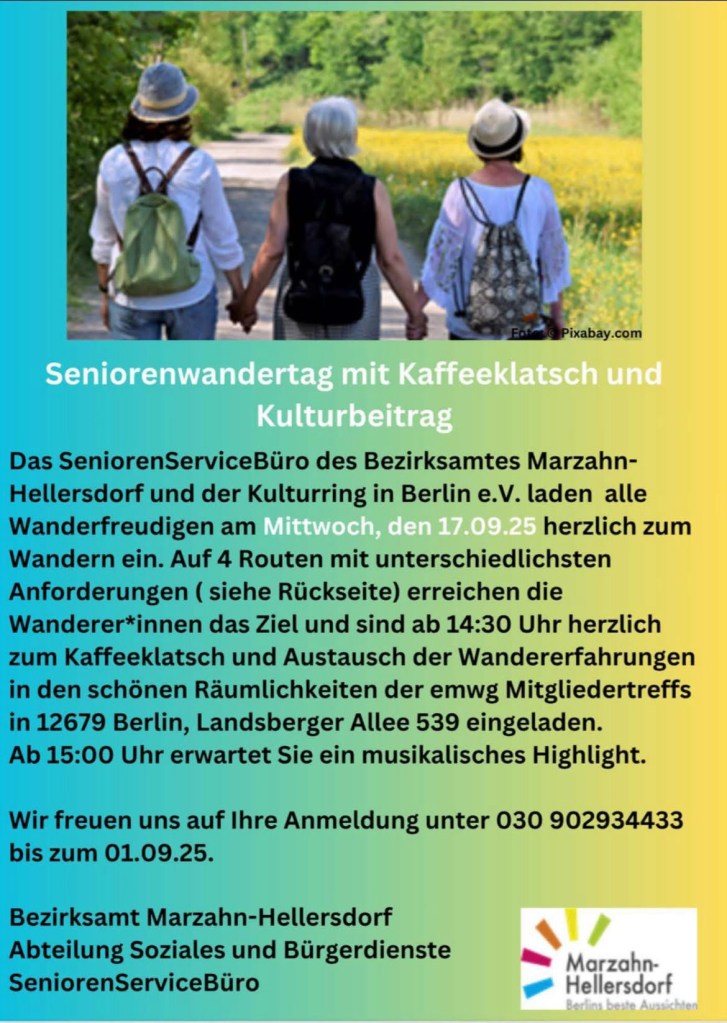 🟧 Unser Seniorenservicebüro lädt ein zur Wanderung am 17. September! Vier verschiedene Touren starten an unterschiedlichen Standorten mit verschiedenen Schwierigkeitsgraden und Längen. Am Ende treffen sich alle zusammen bei Uwe Ehlert im wunderschönen Nachbarschaftstreff der 1. Marzahner Wohnungsgenossenschaft bei Kaffee und Kuchen.