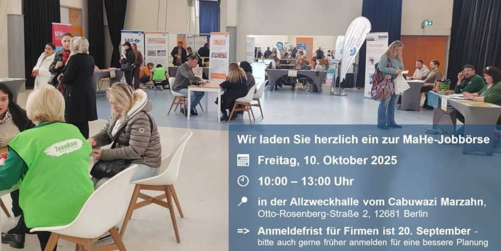 Am Freitag, den 10. Oktober 2025, findet von 9:45 bis 13 Uhr eine Jobbörse für arbeitssuchende geflüchtete Menschen sowie Migrantinnen und Migranten in Marzahn-Hellersdorf statt. Veranstaltungsort ist die Mehrzweckhalle von Cabuwazi Marzahn, Otto-Rosenberg-Straße 2, 12681 Berlin.